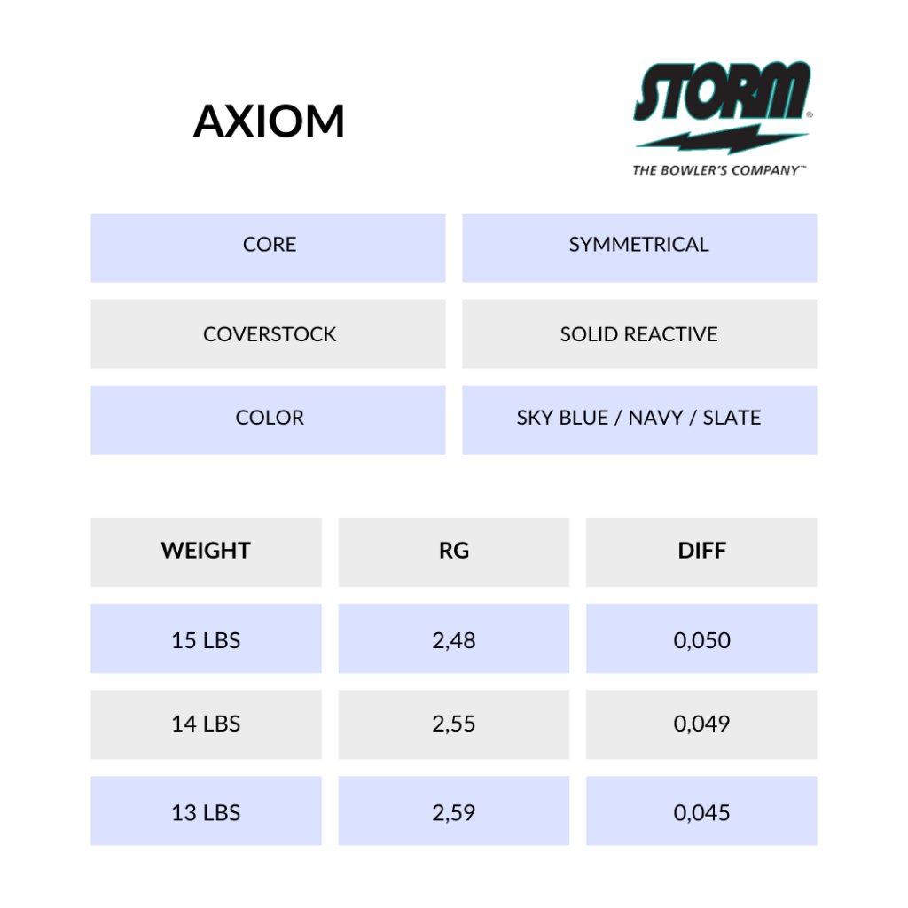 Axiom je víc než jen bowlingová koule. Je to rolující socha, jejíž vzhled je stejně lákavý jako její výkon. Osvědčené symetrické jádro Orbital s RG 2,48 a Diff. 0.050 doplněné povrchem NeX Solid Reactive v úpravě 3000 Grit provede Axiom plynule celou dráhou až do kuželek.