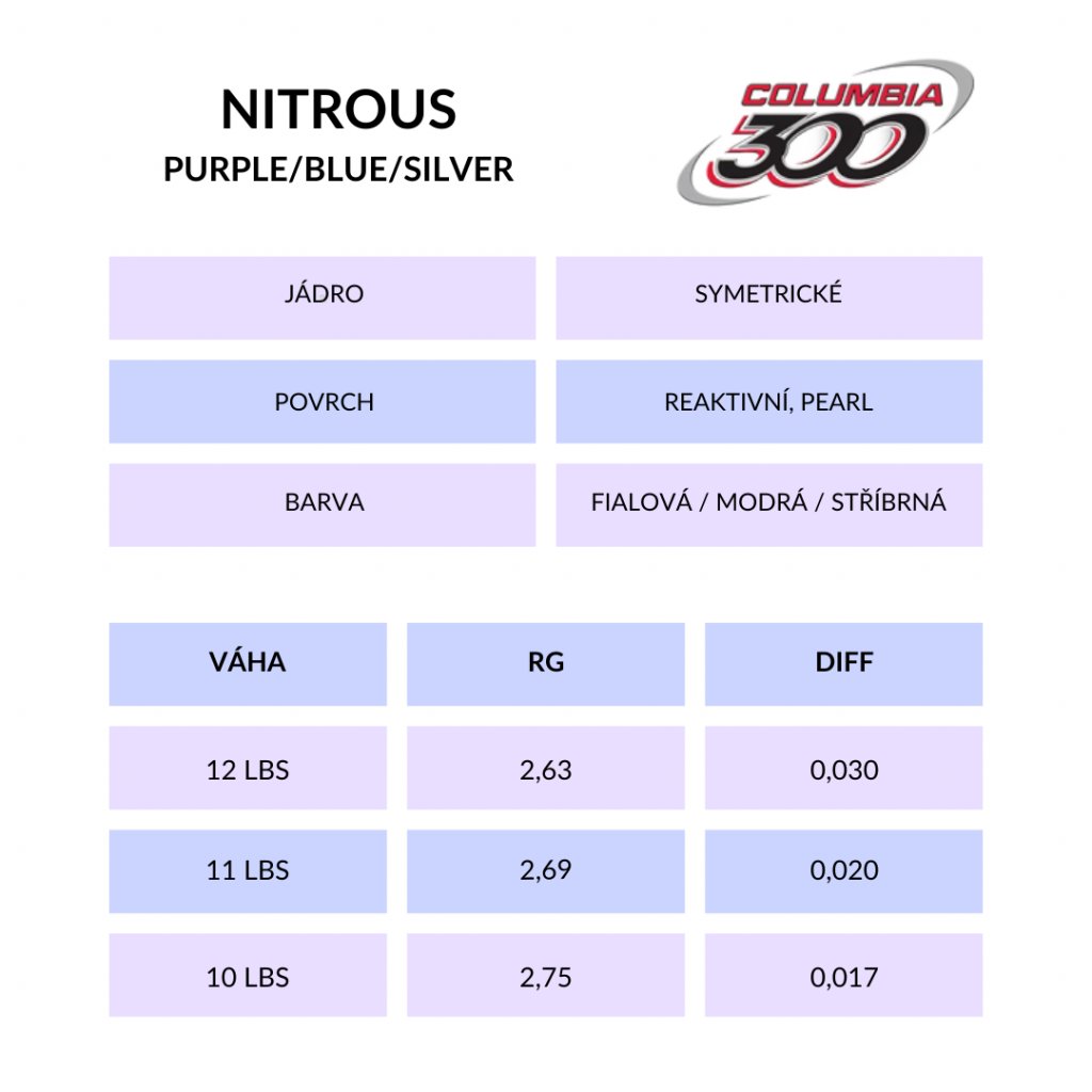 Bowlingová koule Nitrous od společnosti Columbia 300 má zbrusu nové jádro i povrch. Dvoudílné jádro Nitrous nabízí předvídatelnost společně s údernou silou a povrch Boost/R zajistí správnou reakci na kratších a středních mazáních. To znamená, že, ať už je váš styl nebo úroveň vašich bowlingových dovedností jakákoli, díky kouli Nitrous se vaše hra zlepší.